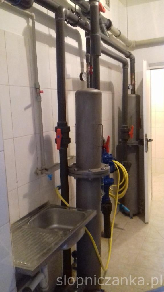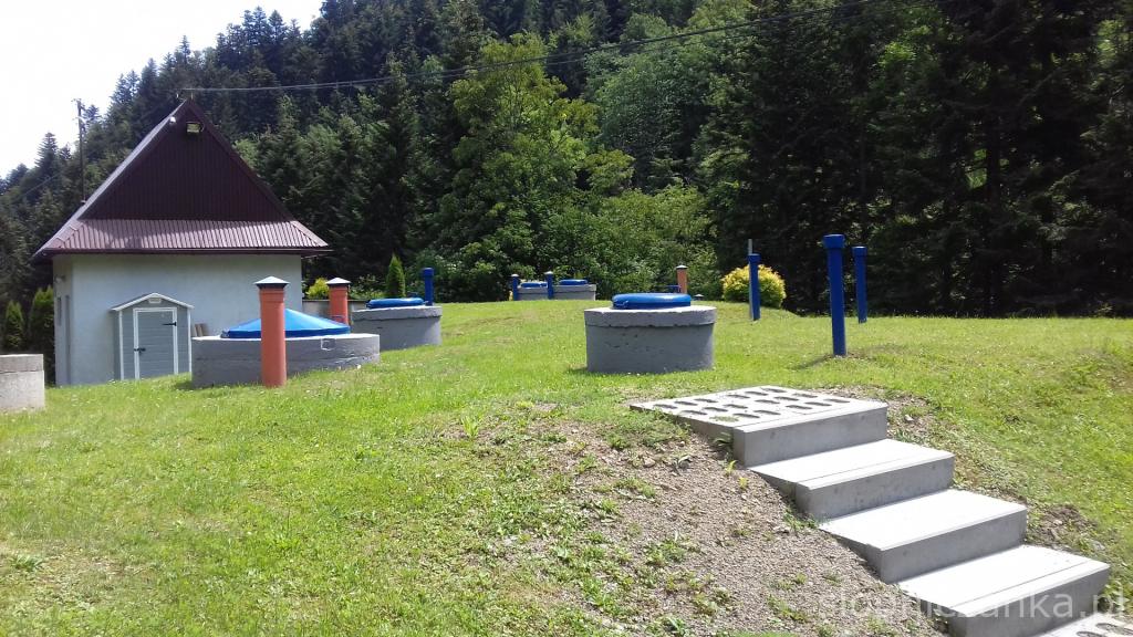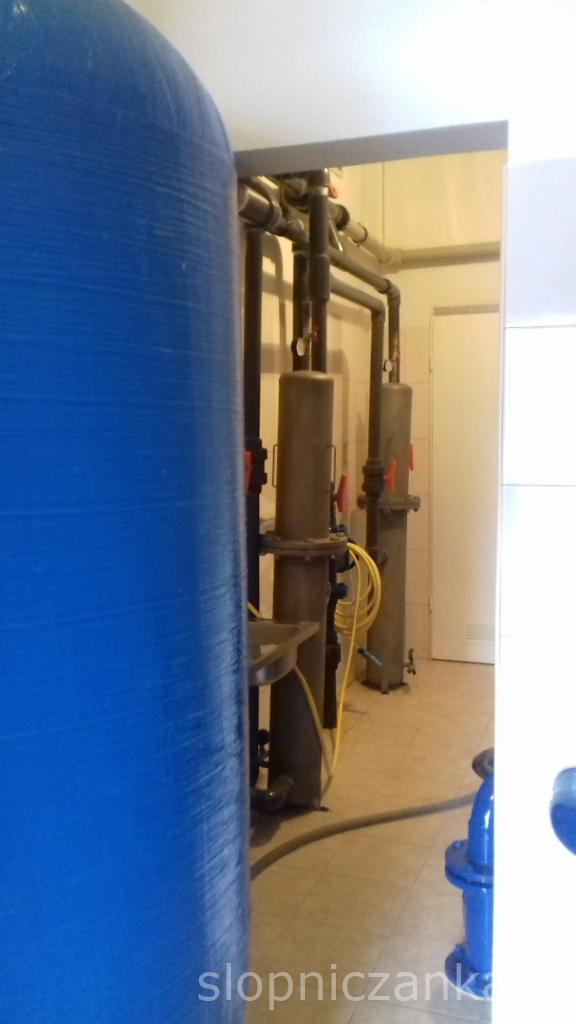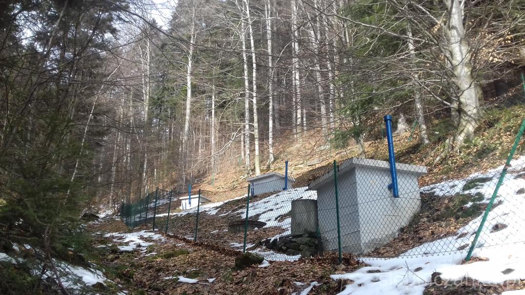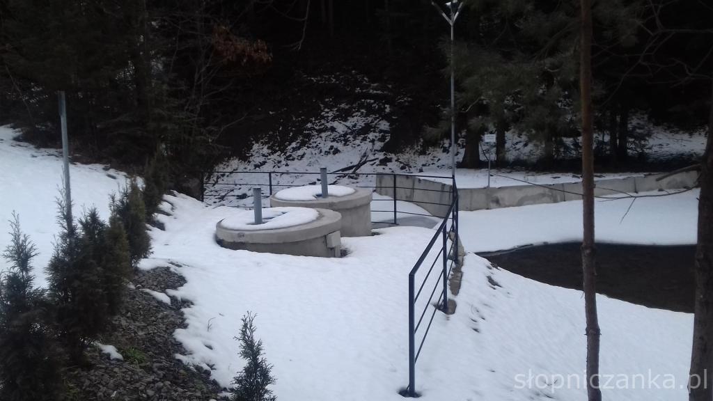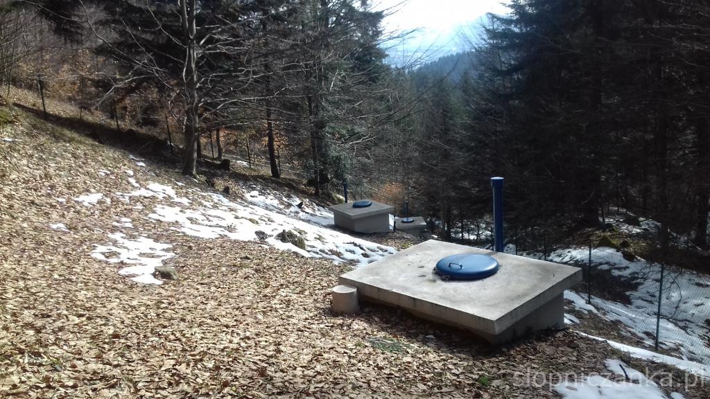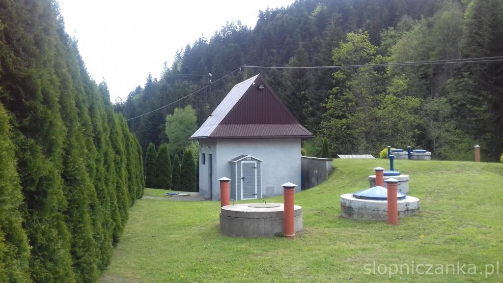 Spółka wybudowała 4 studnie o głębokości 2m, do których zostały podłączone podziemne źródła z Hajdowskiej Góry. Trzy z tych studni znajdują się w odległości ok. 15m od siebie, natomiast czwarta studnia znajduje się ok. 100m niżej i również ujmuje podziemne źródło. Obszar wszystkich tych studni jest objęty ogrodzeniem, a same źródła zabezpieczone są przed niekorzystnymi warunkami atmosferycznymi. Ujęcia te podłączone są do znajdującej się najniżej studni rewizyjnej o pojemność 3 m3 i dobudowanego w późniejszym terminie podziemnego zbiornika o pojemności 10m3. Następnie wybudowano ujęcie na potoku bez nazwy i podłączono je do wyżej wymienionych studni. Woda zebrana w studniach rewizyjnych sprowadzana jest pod własnym ciśnieniem, grawitacyjnie, do dwóch głównych zbiorników wyrównawczych o pojemności 100 m3 , przed którymi zainstalowana jest zasuwa regulująca dopływ wody. Jeden z nich wybudowany został przez Urząd Gminy Słopnice w 2005 roku i oddany Spółce w bezpłatną dzierżawę odnawianą co 5 lat. Przy każdym z dwóch zbiorników wyrównawczych zamontowane są filtry oczyszczające wodę oraz dozowniki chloru. Ze względu zmniejszania się zasobów wody podczas suszy, zmniejszania się poziomu wody w źródłach oraz innych jej niedoborów, zostało wybudowane awaryjne ujęcie na Potoku Czarna Rzeka. Składa się ono z zapory oraz dwóch studni o głębokości 5m. Poziom obu studni uzupełniany jest samoczynnie. W końcowej studni zainstalowana jest pompa podająca wodę do głównego zbiornika. Następnie woda z dwóch zbiorników wyrównawczych rozprowadzana jest rurociągiem wykonanym z rur PCV w większości o przekroju Ø 160. W dalszej kolejności są one zredukowane na rury stalowe o przekroju Ø 100. Przy końcowych rozgałęzieniach przekrój rur stalowych ulega zmniejszeniu do Ø 80. Tym sposobem woda trafia do części mieszkańców Słopnic.