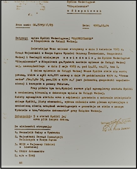 Pierwszy statut Spółki został zatwierdzony przez Naczelnika Gminy Tymbark inż. Józefa Bożka, a od 2 maja 1985 roku Spółka Wodociągowa „Słopniczanka” została wpisana do Księgi Wodnej woj. nowosądeckiego i zaczęła posiadać osobowość prawną.